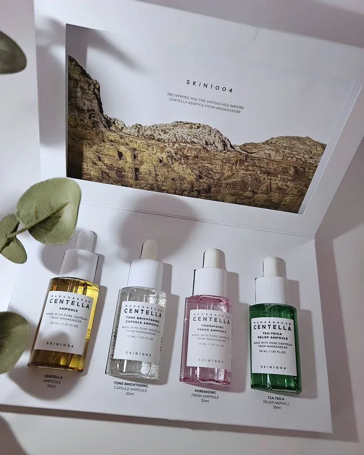 Découvrez le coffret prestige Madagascar Centella Ampoule Kit de SKIN1004, une sélection de 4 ampoules concentrées destinées à revitaliser, apaiser, illuminer et équilibrer votre peau. Importé directement de Corée du Sud, chaque flacon de 30 ml est formulé pour répondre aux besoins spécifiques de différents types de peaux